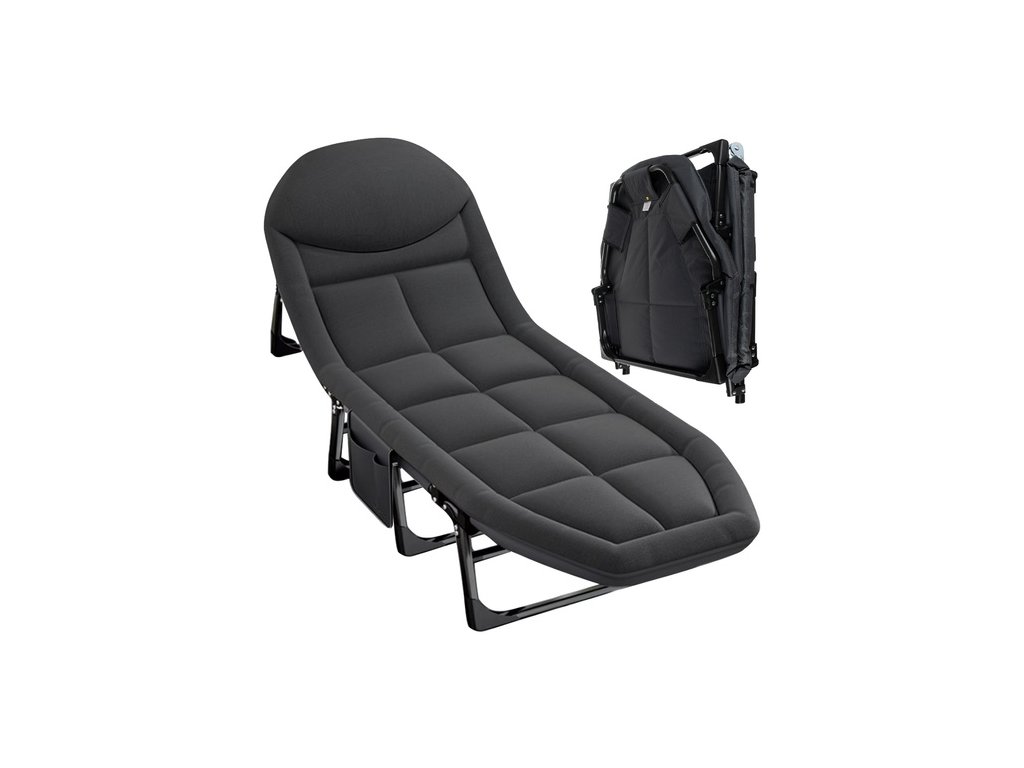 Skládací kempingové lehátko, cestovní postel s pohodlnou matrací, odolným rámem a nastavitelnou opěrkou hlavy je ideálním řešením pro kempování, relaxaci na zahradě i domácí použití.